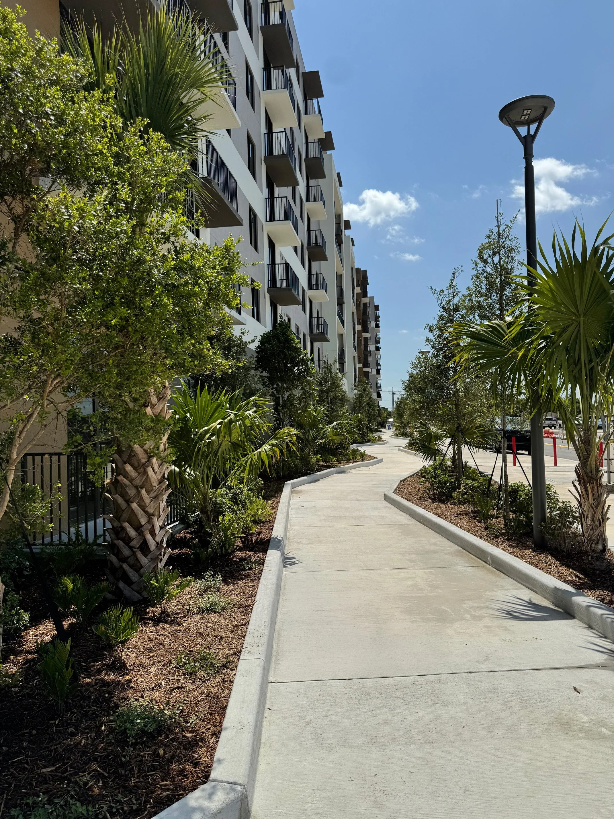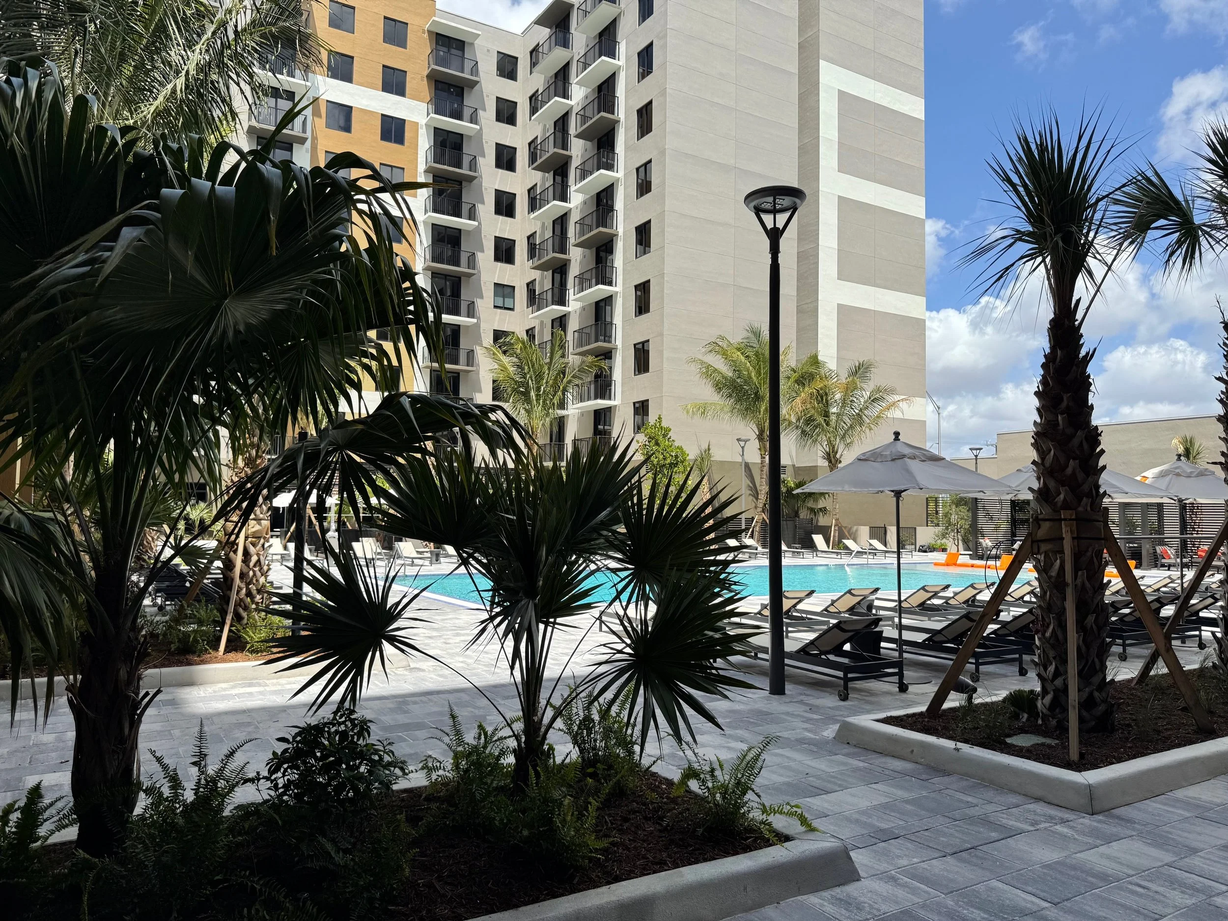 Metro Parc is a transit-oriented, mixed-use development and the first of its kind in Hialeah’s new transit district centered around the Metrorail Transfer Station. The project includes mid-rise residential units and ground-level retail space. The landscape design features extensive native planting throughout, with large planters that accommodate both trees and a diverse understory. The result is a lush environment that reflects South Florida’s sub-tropical character while supporting local pollinators and bird habitat. The development also includes a large amenity deck with a swimming pool, cabanas, and a barbecue area. LandscapeDE provided planting design as well as conceptual design for the hardscape, pool, shade structures, and amenity areas. The firm also selected the streetscape furnishings